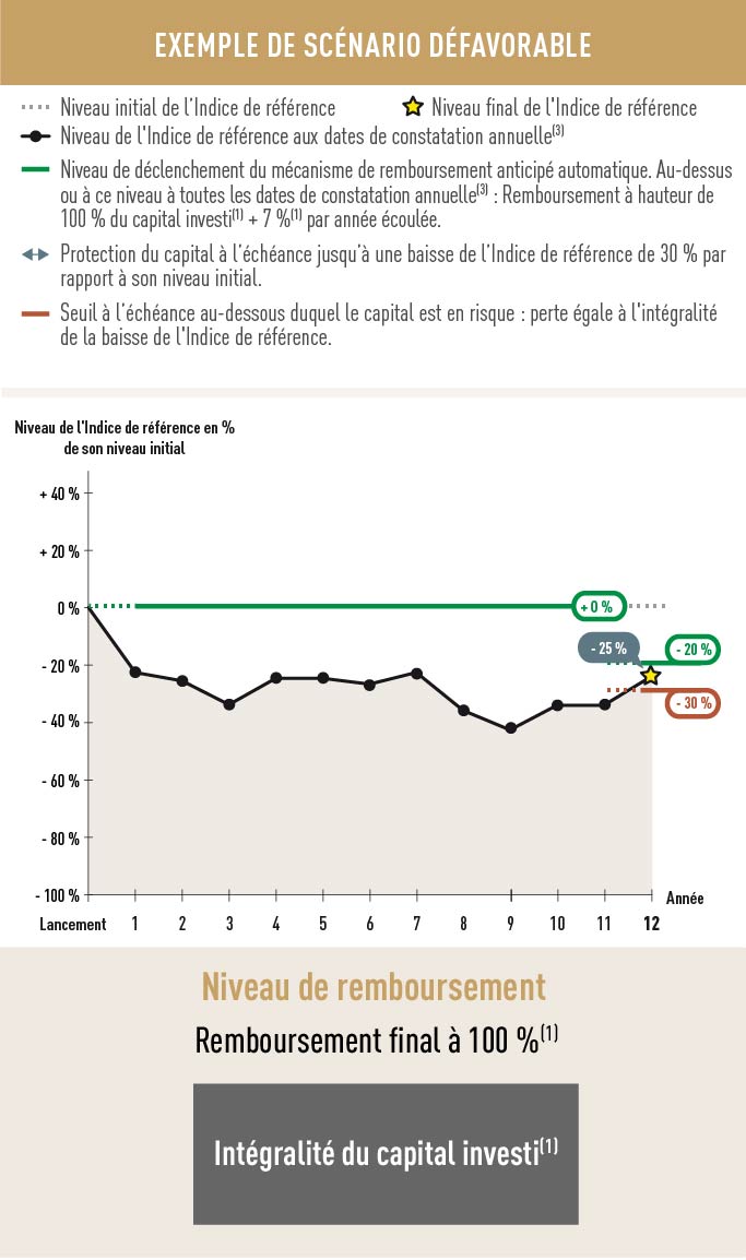 Commercialisation dans le cadre du contrat d’assurance-vie, de capitalisation ou de retraite – L’instrument financier décrit dans ce document (ci-après l’ "Instrument Financier") est proposé dans le cadre du contrat d’assurance-vie, de capitalisation ou de retraite (ci-après le "Contrat d’Assurance Vie"), l’Instrument Financier est un actif représentatif de l’une des unités de compte de ce contrat. Ce document ne constitue pas une offre d’adhésion au Contrat d’Assurance-Vie. L’assureur s’engage exclusivement sur le nombre d’unités de compte mais non sur leur valeur, qu’il ne garantit pas. Il est précisé que l’entreprise d’assurance d’une part, l’Émetteur et le Garant de la formule d’autre part sont des entités juridiques indépendantes. Ce document ne constitue pas une offre, une recommandation, une invitation ou un acte de démarchage visant à souscrire ou acheter l’Instrument Financier qui ne peut être diffusé directement ou indirectement dans le public qu’en conformité avec les dispositions des articles L. 411-1 et suivants du Code monétaire et financier.