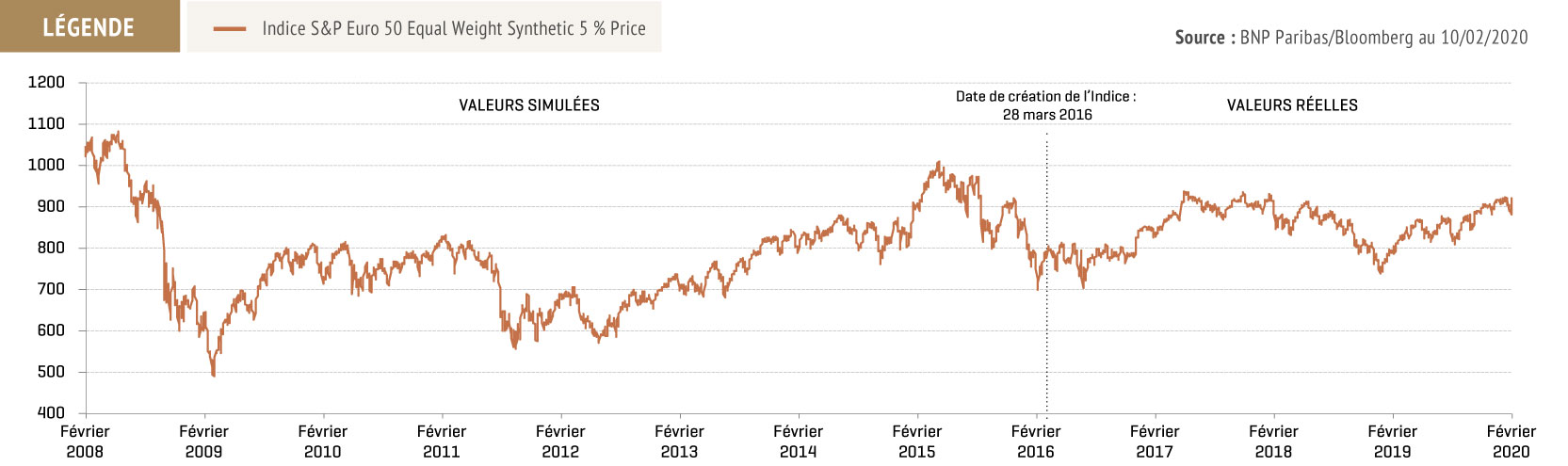 - L’Indice est équipondéré et calculé, dividendes nets réinvestis, diminué d’un montant forfaitaire de 5 % par an. Le montant des dividendes réinvestis dans l’Indice peut être inférieur ou supérieur au montant forfaitaire de 5 % par an.