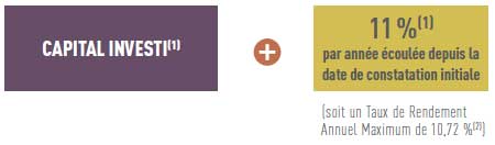 - Un remboursement automatique anticipé tous les ans à hauteur du capital investi majoré d’un gain de 11 % par année écoulée depuis la date de constatation initiale (soit un TRAB maximum de 10,72 %) si la performance de l’Indice est supérieure ou égale à 5 % à l’une des dates de constatation annuelle par rapport à son niveau initial.