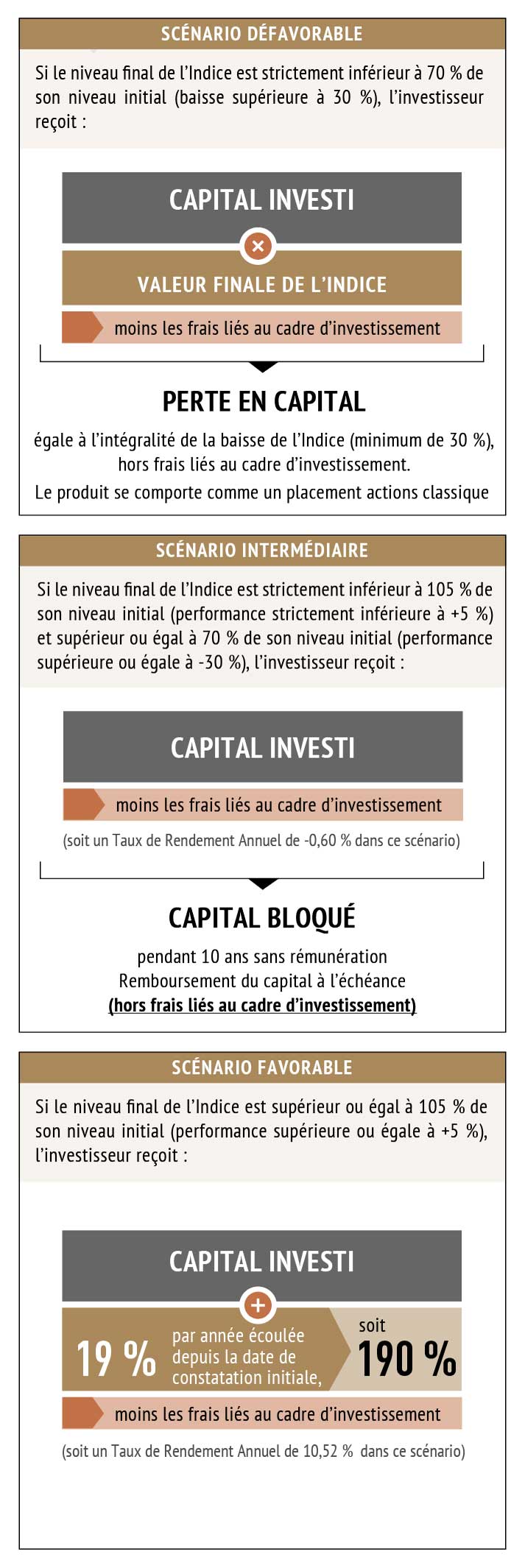 - À l’échéance des 10 ans : en cas de baisse de l’indice de plus de 30 % par rapport à son niveau initial. L’investisseur est exposé à une perte en capital d’au moins 30 %.