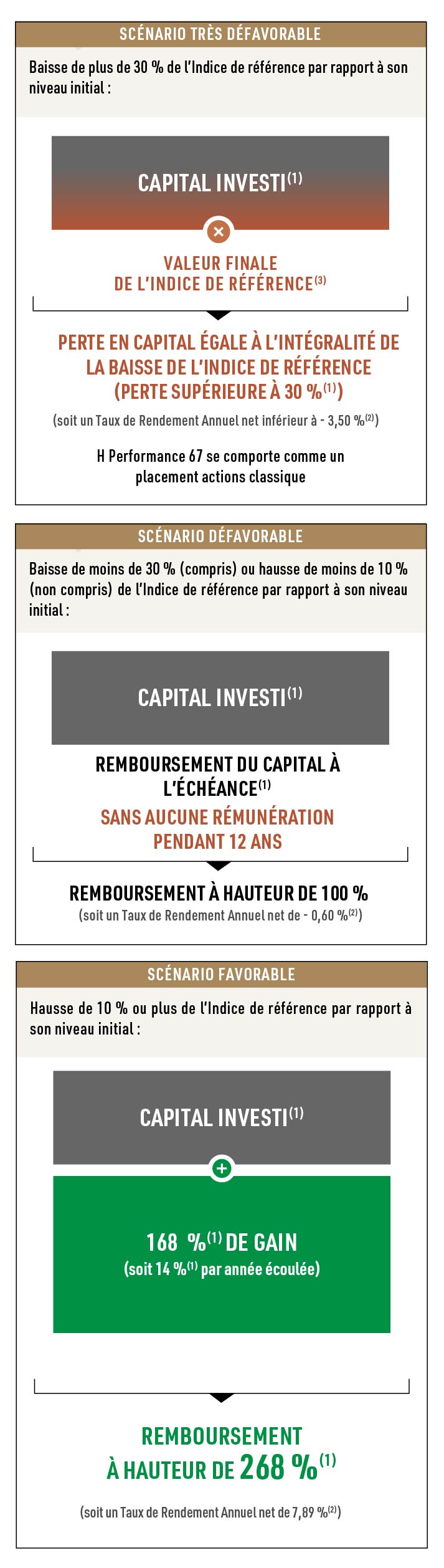 La valorisation de H Performance 67 en cours de vie peut connaître d’importantes fluctuations, en raison de l’évolution, non seulement du niveau de l’Indice de référence, mais aussi notamment de sa volatilité et des taux d’intérêt. Les frais de conception, de structuration, de promotion et de distribution sont déjà inclus dans la formule de remboursement et ne viennent donc pas diminuer l’objectif de gain. Ces frais se répercutent cependant dans la valorisation en cours de vie, notamment sur les premiers mois.