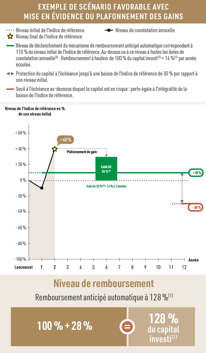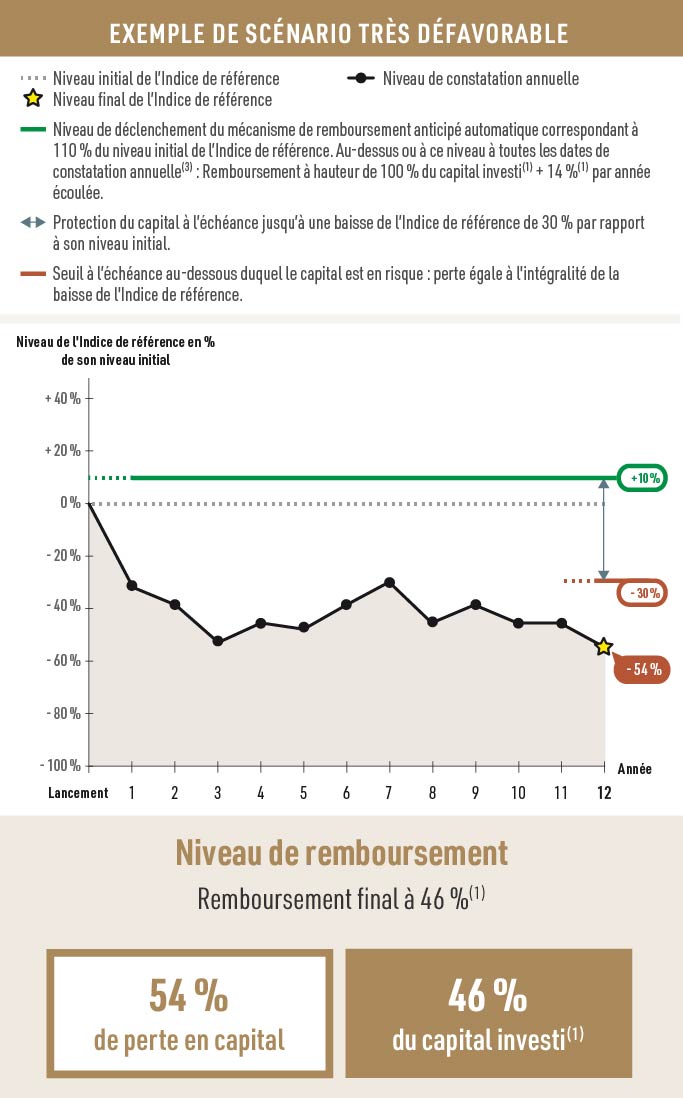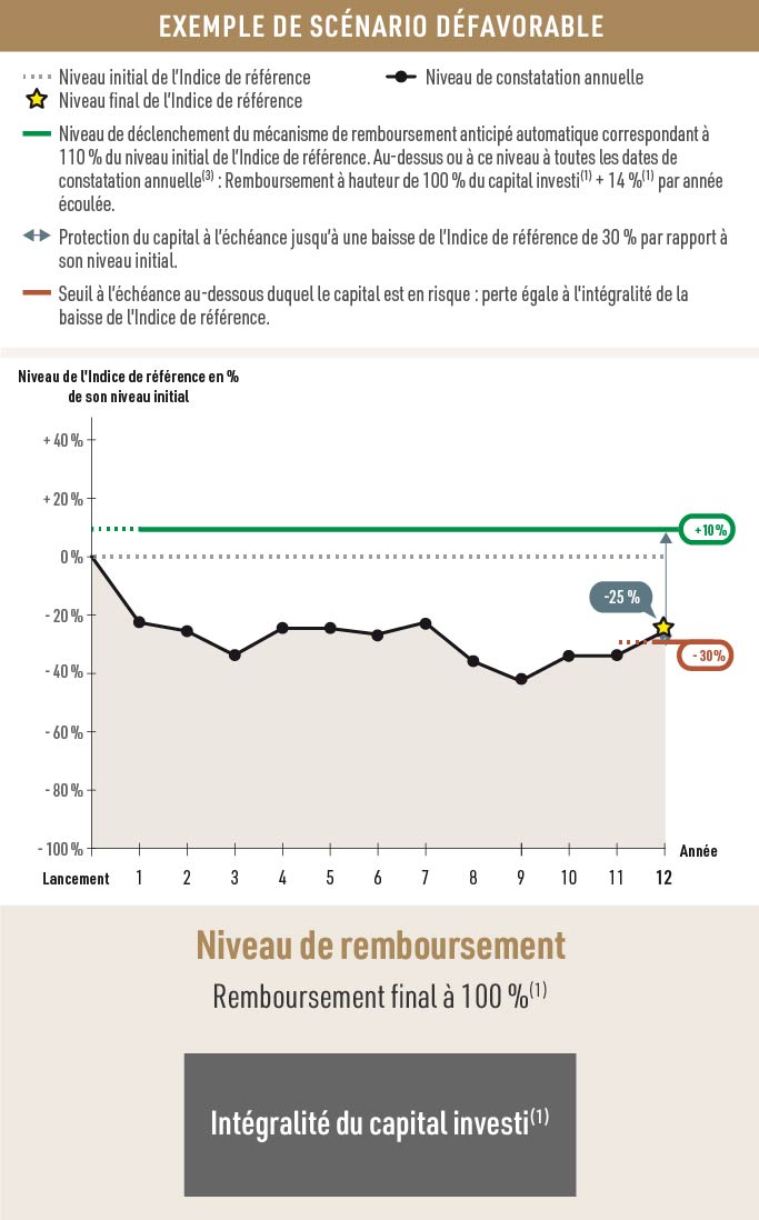 En cas de revente avant la date d’échéance(1) ou, selon le cas, avant la date de remboursement anticipé automatique(1), il est impossible de mesurer a priori le gain ou la perte possible, le prix de cession dépendant alors des paramètres de marché du jour. La perte, notamment, peut être partielle ou totale.