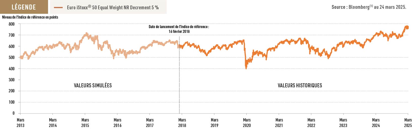 Ce montant dépend de la performance de l’Indice de référence Euro iStoxx® 50 Equal Weight NR Decrement 5 % (dividendes nets réinvestis en retranchant un prélèvement forfaitaire de 5 % par an). Dans le cas d’une évolution défavorable de la performance de l’Indice de référence, les souscripteurs pourraient subir une baisse substantielle des montants dus lors du remboursement et pourraient perdre tout ou partie de leur investissement.