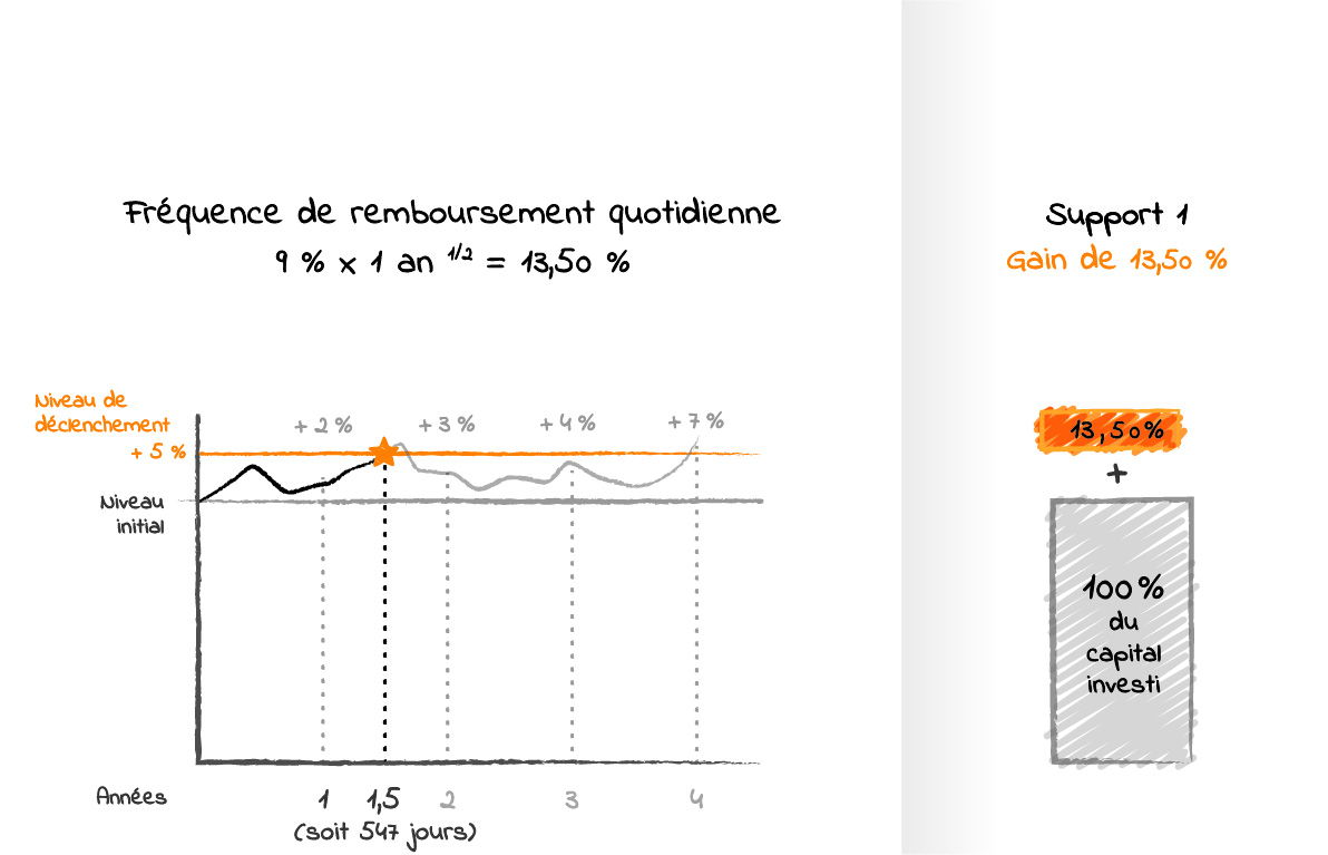 - L'Indice de référence atteint son niveau de déclenchement au 547ème jour (au milieu de la deuxième année). La condition est donc remplie et son remboursement intervient avec un gain prorata temporis sur la base d'une rémunération annuelle de 9 %, soit 13,50 % sur toute la durée écoulée de 1 année 1/2 (hors frais liés au cadre d’investissement et avant prélèvements sociaux et fiscalité).
